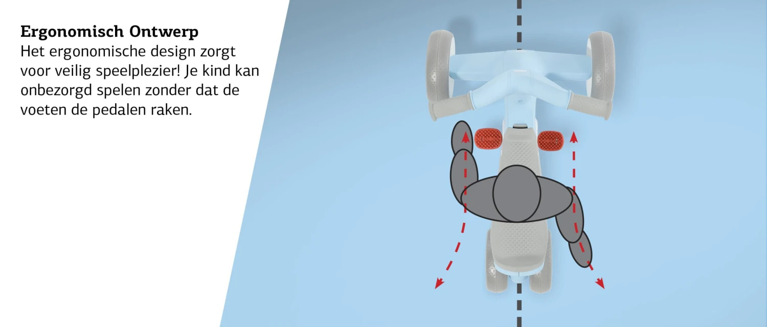- Ergonomisch design zorgt voor veilig speelplezier. Je kind kan onbezorgd spelen zonder dat de voeten de pedalen raken.