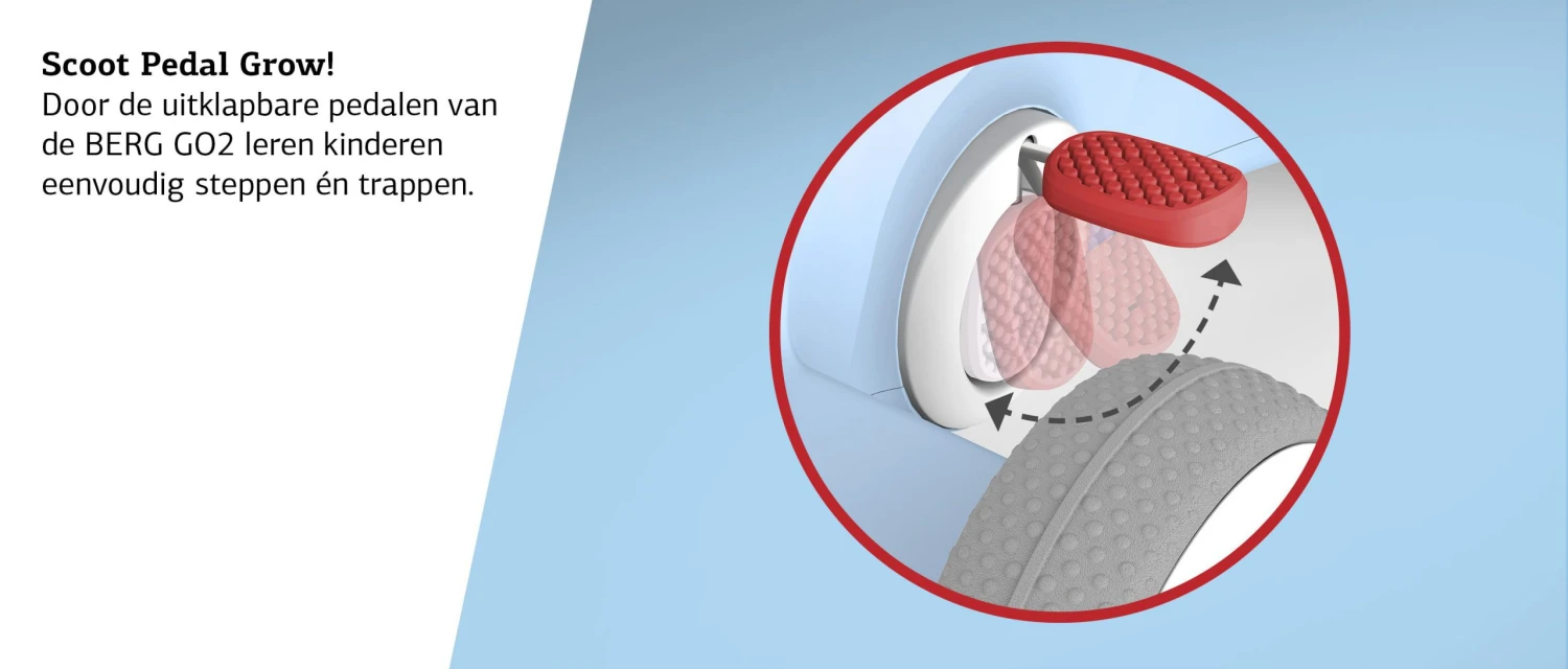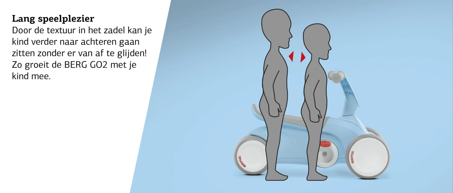 - Door de textuur in het zadel kan je kind verder naar achter gaan zitten zonder eraf te glijden.Zo groeit de BERG Go2 mee met je kind.