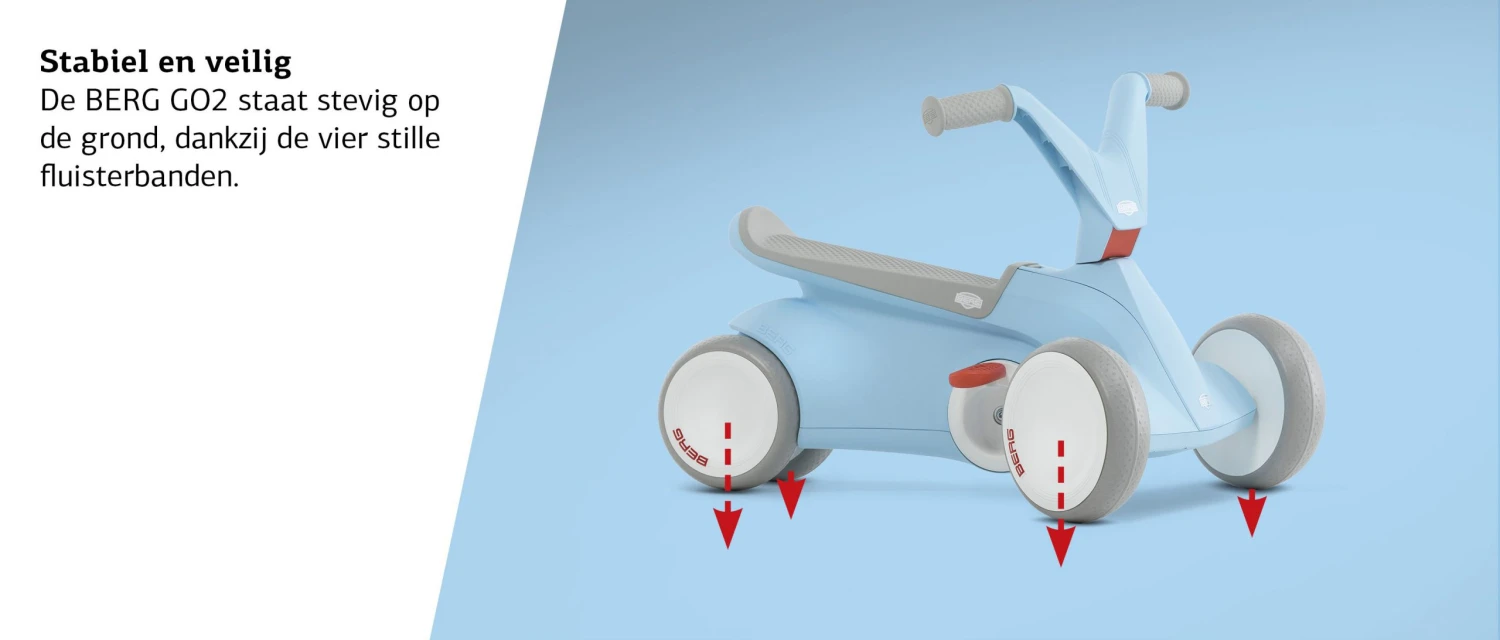 - De BERG go2 staat stevig op de grond dankzij de 4 fluitserstille wielen.
