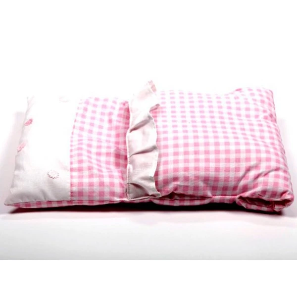 Prachtig slaapzakje, rose met wit geblokt, speciaal voor de houten poppenwagens. Past in de houten poppenwagen en poppenwagen de luxe.