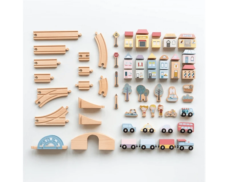 Ga op eindeloze avonturen met de houten treinbaan van Little Dutch. Stap op de trein, de bus, de taxi of in de auto en verken de stad. Met meer dan 100 onderdelen, biedt deze set veel creatieve opties om telkens weer nieuwe combinaties te bouwen. De set bevat een locomotief met drie wagons, rechte rails, bochten, een brug, verschillende gebouwen, autoβs, personen, bomen, bloembakken, verkeersborden, lantaarnpaal, stoplicht, bus, ijswagen, hondje en een fiets.Β Elk houten figuur is aan beide kanten voorzien van een gedetailleerde illustratie. Bijbehorende speelsets, zoals de houten voertuigen, een dierentuin en een garage, zijn verkrijgbaar voor nog meer speelplezier.