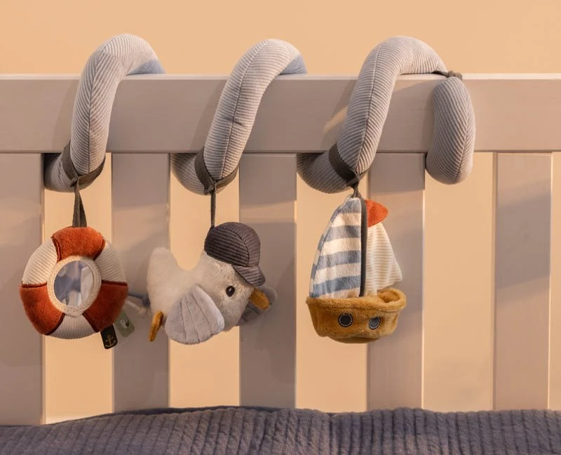 Ahoy, kleine matroos! Elke dag wordt een nieuw avontuur in de baai met deze uitnodigende activiteitenspiraal. Dit uitdagende speelgoed is gemaakt van katoen en corduroy en heeft verschillende speeltjes, waaronder een zeemeeuw, een zeilboot en een reddingsboei met verschillende leuke labels en een spiegeltje voor zelfontdekking. De spiraal stimuleert de eerste hand-oogcoördinatie van je kleintje en zorgt voor urenlang vermaak. Je kunt hem gemakkelijk bevestigen aan de box, een autostoeltje of kinderwagen.