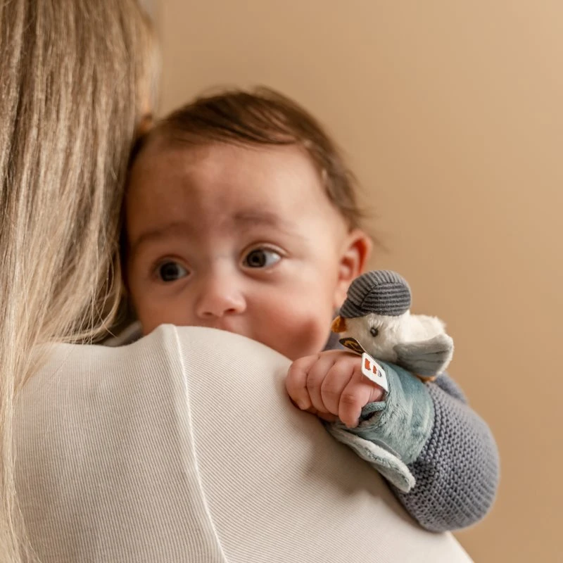 Zwaai met je handen en laat je verrassen! Wat zal je baby enthousiast worden van deze armbandrammelaar. Doe hem om de pols van je kleintje en laat het ratelende plezier maar beginnen. De knuffelige zeemeeuw bovenop de armband is klaar om te bewegen! Maar er is meer te ontdekken. De knisperende vleugeltjes, labels en het kleine koordje stimuleren je kindje om te voelen en te grijpen. Geweldig vermaak voor een blije baby.