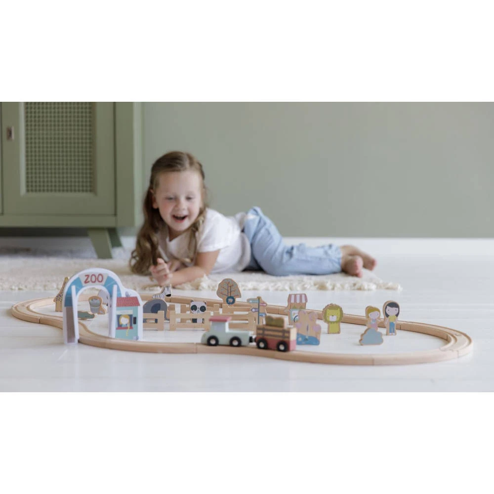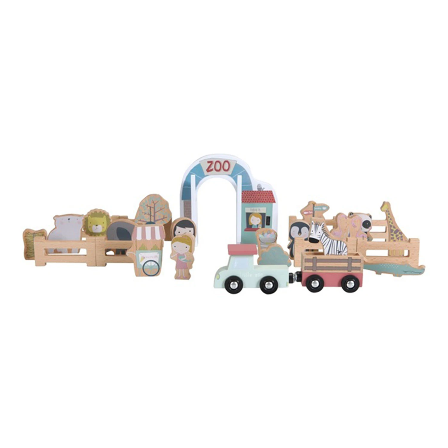 Deze houten dieren en elementen uit de dierentuin zijn perfect als toevoeging bij de treinbaan. Maak van de laatste stop met de trein een gezellige dag in de dierentuin! Ontworpen voor je kindje om zijn/haar eindeloze fantasie uit te drukken. De uitbreiding bevat een ticketbalie met entreepoort, een onderhoudswagen met trailer, ijskraam, zebra, olifant, ijsbeer, pinguïn, giraffe, leeuw, panda, flamingo’s, krokodil, hooi, emmer met vis, bezoekers, struik, wegwijzer, boom en hek. Elk dier past in de trailer voor uren speelplezier. De voertuigen passen op de treinbaan, waardoor ze door de dierentuin kunnen rijden. Uitbreiding sets voor de treinbaan zijn beschikbaar.