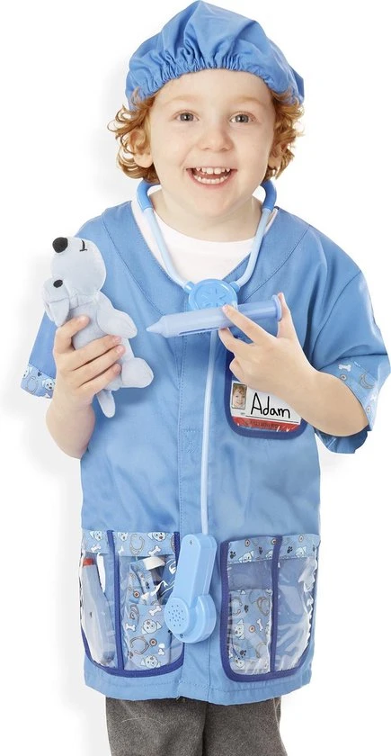 Je laat de verzorging van alle speelgoedhuisdieren in goede handen achter wanneer jouw kleine dierenarts zich aankleedt. Alles kan in de wasmachine worden gewassen. De set bevat naast het pak een stethoscoop met geluidseffecten, een spuit, een thermometer, een masker, een haarnetje, verband, een herbruikbaar naamkaartje voor een dierenarts en een knuffelpuppy om beter te maken.