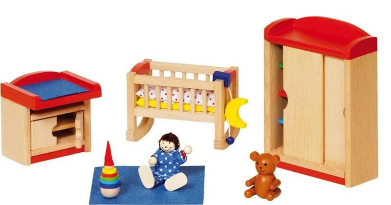 12-delige meubel- en accessoirepakket voor het poppenhuis. De set bestaat o.a. uit een baby, schommelwieg, kledingkast, kommode en speelgoed.