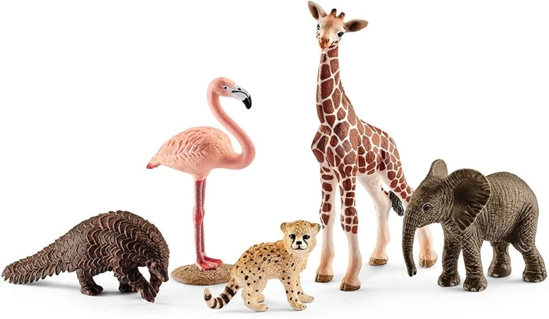 De set bevat vijf dieren uit de Afrikaanse savanne: een luipaardenwelp, reuzenschubdier, flamingo, giraffekalf en een kalf van een Afrikaanse olifant. De dierenwereld van Afrika boeit door de rijke verscheidenheid aan soorten. Op de hete savannes van Zuid- en Oost-Afrika leven olifanten, giraffes en gevaarlijke roofkatten zoals het jachtluipaard. Het reuzenschubdier komt voor in de tropische regenwouden van Centraal-Afrika en de flamingo zoekt graag naar kreeften in de grote zoutmeren.