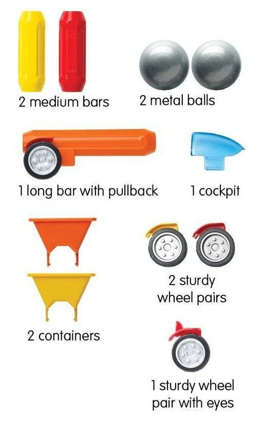Bouw en speel! Zie hoe snel je kan gaan met één, twee of geen extra wagons! Laad en race of stel een andere trein samen. Maak snelle constructies met het ingebouwde pull-back systeem! Alle onderdelen kunnen worden gecombineerd met de bestaande SMARTMAX®-sets. Samen met de staven en metalen ballen, kom je tot een eindeloze reeks mogelijkheden!