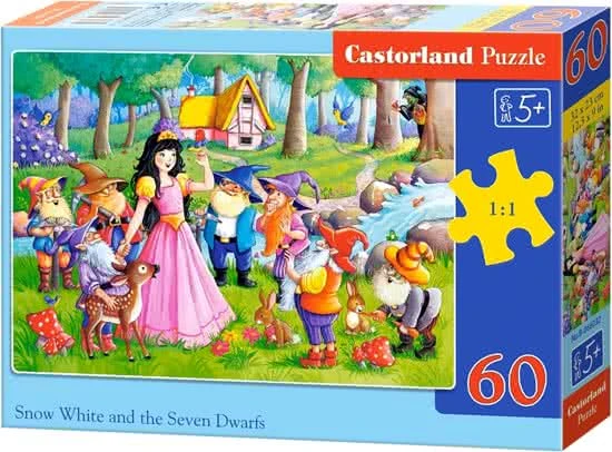 Castorland puzzel Snowwhite and the 7 dwarfs. Deze puzzel bestaat uit 60 stukjes en heeft een afmeting:32 x 23 cm.