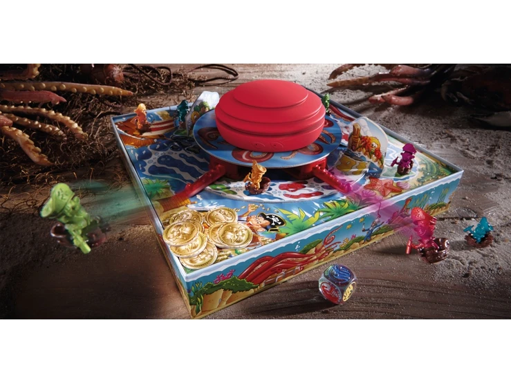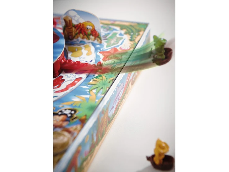 Want als hij ze ontdekt, strekt hij bliksemsnel zijn tentakels uit en gooit alle schepen door elkaar! Alleen wie geluk heeft, kan de goudstukken op het eiland bereiken.